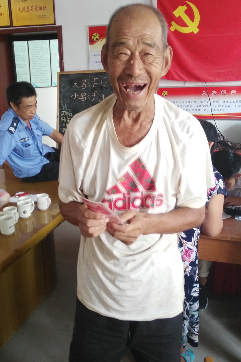 盼望着,盼望着,村里的苗圃基地终于可以“摇钱”了。前天晚上,城投邱工电话告知,第二天上午到村把之前村民到基地务工的工资给发一下。所以,今天一大早,村里就在广播里下通知,让村民们都在家等着。等丛会计和邱工过来的时候,战书记又在广播里宣传了一遍,之后,村民们陆陆续续地结伴而来。当时的场面着实热闹,只见大家你说一句,我说一句,也在瞬间把村委会议室给占满了。随后,开始组织排队领工资,确认单据、领钱、盖手印,一套流程下来,大家仔细地点点钱,再看其他人,有比较多少的,有继续留下凑热闹的,有满心欢喜的!尤其是陈作仁大爷,今年已是81岁的高龄,当我问“大爷,您这发了多少时?”大爷满脸的笑容,把攥在手里的钱递给我看,就在这时,我抓拍了一张!看到这幸福的笑容,让我想到基地从无到有的全过程,调研座谈、平整土地、联系村民务工、放线挖穴、卸车栽植、扶正填埋、杀菌管护…. 仿佛昨天、历历在目,更不忘当时陈大爷一下子纵身爬跃到装卸车的情景,吃惊而担心,而今,看到他如此高兴,觉得之前的工夫真的没白费、太阳也没白晒,那种感觉是发自肺腑的,很值很欣慰!?xml:namespace>